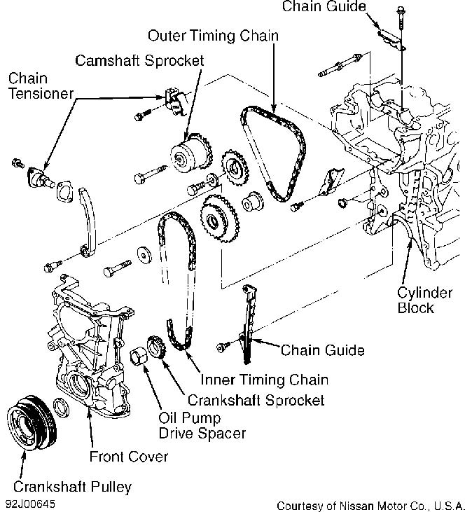 Fig. 6: Exploded View Of Timing Chain Components Courtesy of Nissan Motor Co., U.S.A.