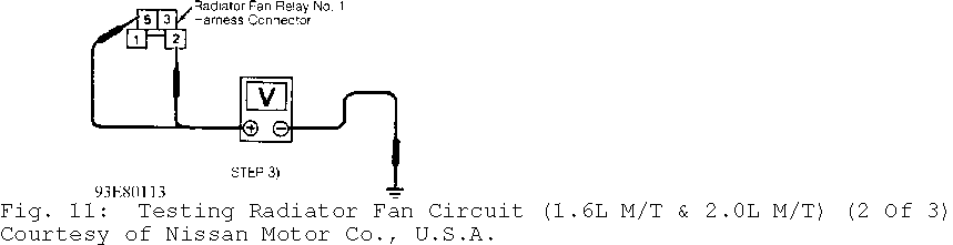 Fig. 5: Testing Radiator Fan Low Speed Circuit; Step 1 (1.6L A/T) Courtesy of Nissan Motor Co., U.S.A.