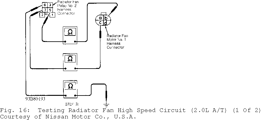 Fig. 7: Testing Radiator Fan High Speed Circuit (1.6L A/T) (1 Of 3) Courtesy of Nissan Motor Co., U.S.A.