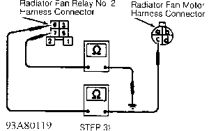 Fig. 6: Testing Radiator Fan Low Speed Circuit; Step 3 & 4 (1.6L A/T) Courtesy of Nissan Motor Co., U.S.A.